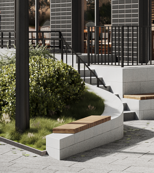 Основным материалом отделки выбран среднеформатный керамогранит, близкий к размерам кирпича